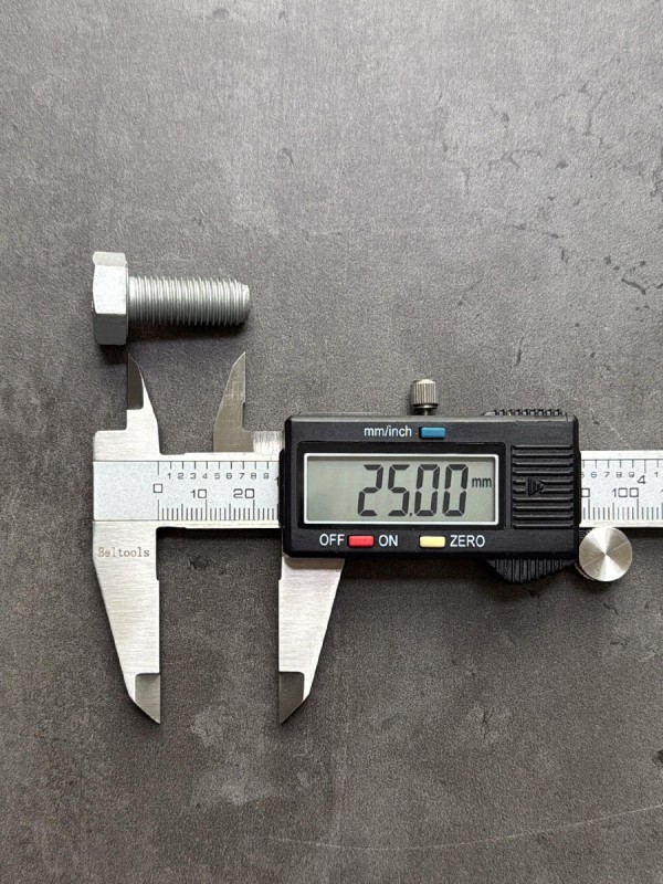 Болт с шестигранной головкой, высокопрочный, мелкий шагом резьбы. Стандарт: таблица FIAT-ВАЗ 10312. Диаметр резьбы: 12 мм. Шаг резьбы: 1,25 (мелкий). Длина болта: 25 мм. Длина резьбы: 25 мм. Размер "под ключ": 19 мм. Класс прочности: 10.9. Покрытие: цинк-ламель. В соответствии со стандартами, длина болта измеряется от опорной части головки до конца фаски, которой завершается его резьбовой стержень.