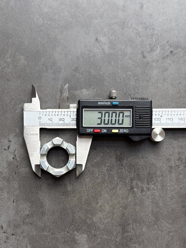 Гайка М24х1,5 корончатая, мелкий шаг резьбы. Гайка российского производства. Артикул: 853514. Применяемость: гайка рулевого пальца КАМАЗ. Диаметр резьбы: 24 мм. Шаг резьбы: 1,5. Высота: 20 мм. Размер "под ключ": 36 мм. Высота от опорной поверхности до основания прорези: 14 мм. Покрытие: цинк.
